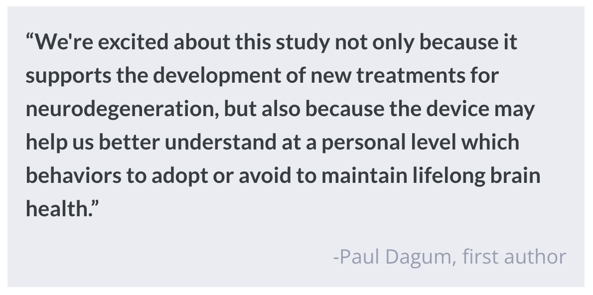 This device is the first to track glymphatic function in humans in a non-invasive and relatively time-resolved manner. This is critical to the field of neuroscience because of the glymphatic system’s association with clearing proteins involved in neurodegenerative disease, and its potential role in the control of volume transmission of neuromodulators. As a result, human glymphatic function will be able to be studied in more naturalistic environments. This device may also enable drug discovery by helping scientists understand the effect of certain drugs on glymphatic function.